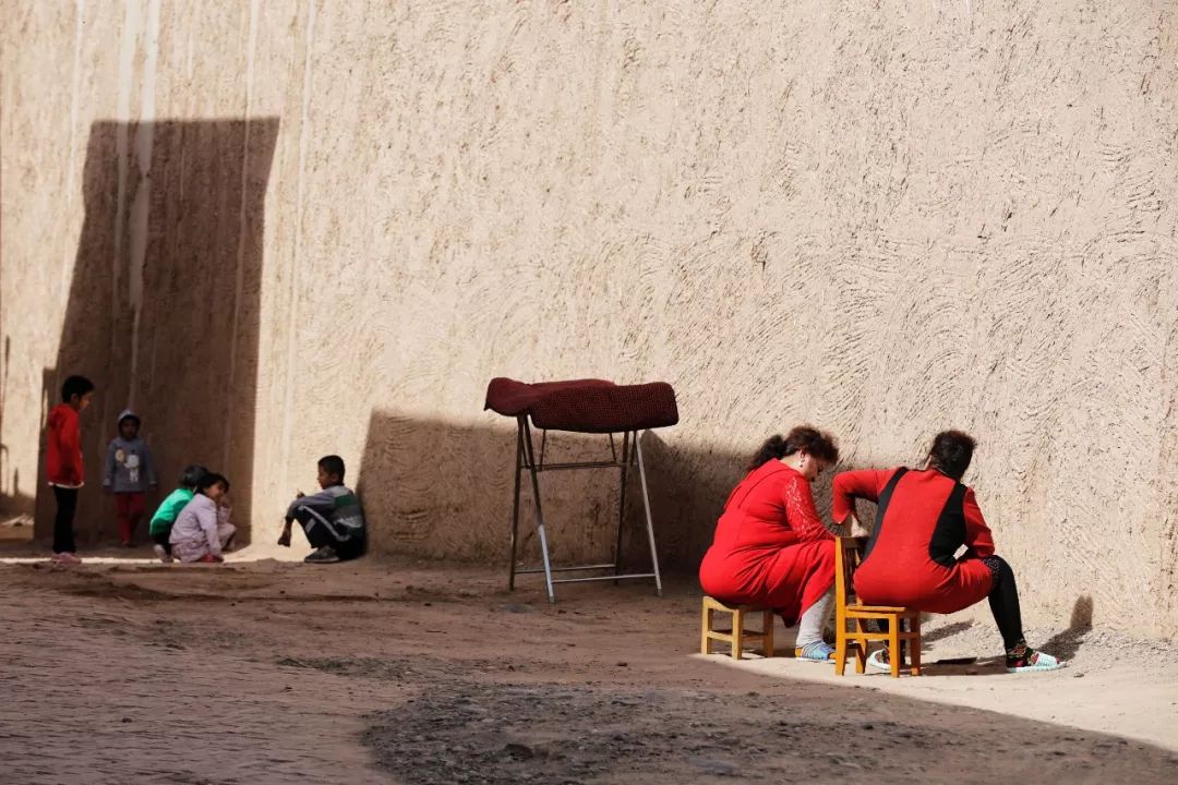 古城民居以土红或土黄色为基调,搭配鲜亮的蓝或绿,大大小小的巷子纵横交错,偶有三五妇女坐在墙边轻声聊天,或是小孩子奔跑着互相嬉笑打闹。