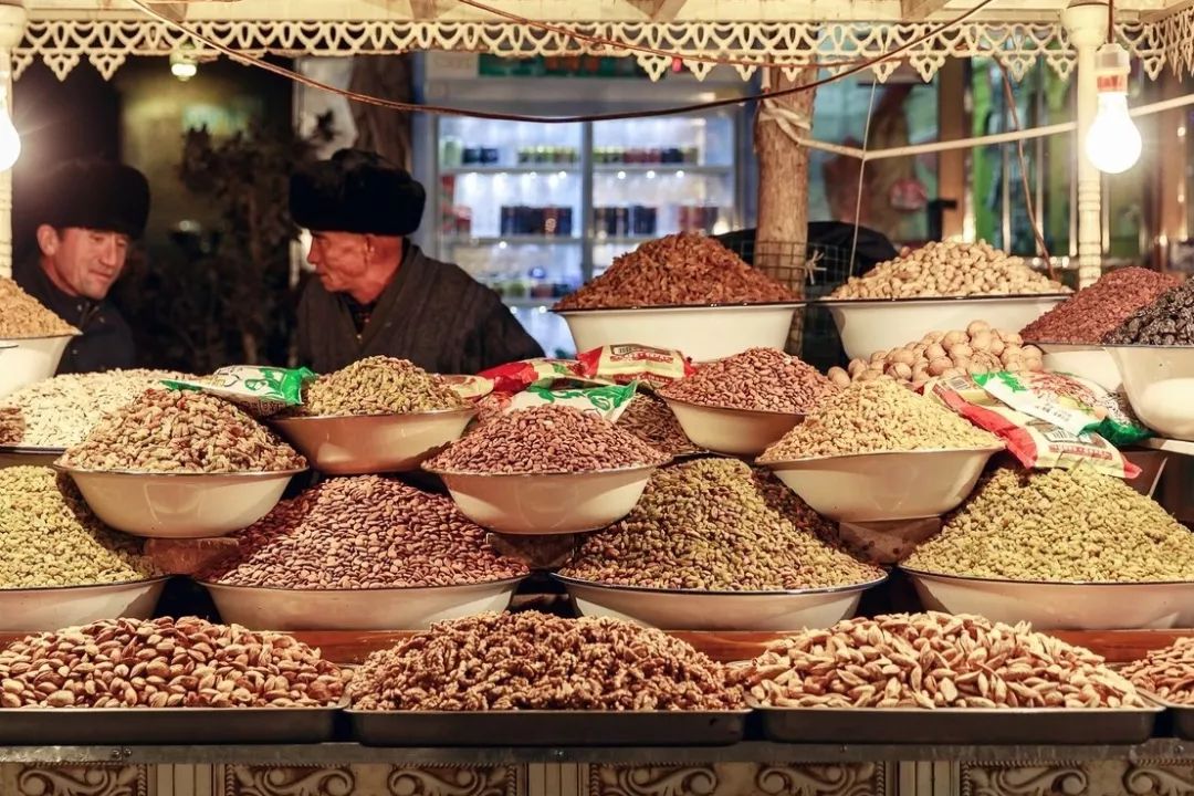 在“巴扎”上,随处可见的地毯摊、花帽摊,陶罐、铁器、卡龙琴,以及各色香料、干果、水果等,应接不暇的色彩,如同被上帝打翻的调色盘。