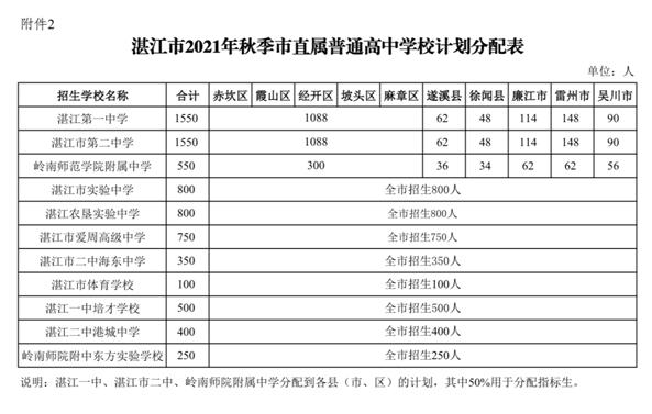 根据计划,今年11所市直属普通高中学校,将在全市招生7600人,其中湛江一中、湛江市二中、岭南师院附属中学分配到各县(市、区)的计划,50%用于分配指标生。