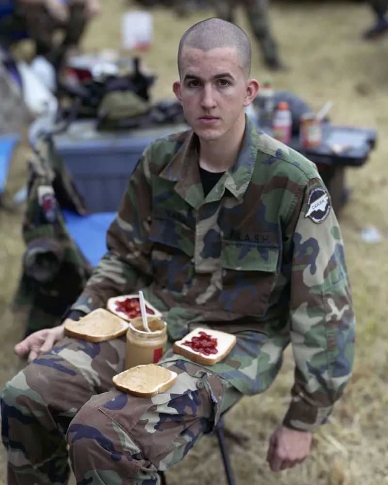 Alec Soth,“我当时正在用一个小相机为一个杂志拍摄野战游戏的照片,但是当我经过这个正在做三明治的小伙子的时候,我意识到应该是大相机出场了。” Josh Vance(别名 Crash)与花生酱和果冻,乔尔顿,田纳西州,美国,2004。© Alec Soth | 玛格南图片社。