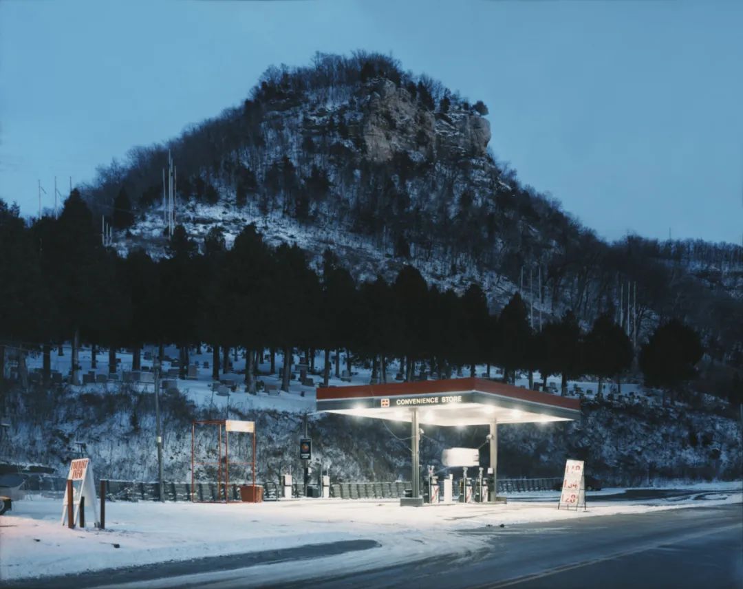 Alec Soth,“因为曝光时间过长,这个照片有很多技术瑕疵。你可以从那些气泵旁边随风飘扬的油布中看出端倪,总体上有些模糊。照片左侧你可以看到一个曝光时开走的汽车留下的影子。但是这是《眠于密西西比河畔》(Sleeping by the Mississippi)中我最喜欢的照片之一。”墓碑,Fountain City,威斯康星州,美国,2002。© Alec Soth | 玛格南图片社。Schuman:你有没有遇见过因为技术问题,照片效果反而比你预想的要好?