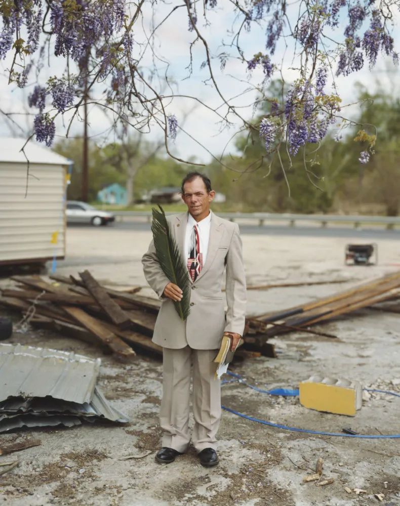 Alec Soth,“他正从教堂回家。周围景物中不同颜色的元素恰到好处。” Patrick,圣枝主日,《眠于密西西比河畔》(Sleeping by the Mississippi),巴吞鲁日,路易斯安那州,美国,2002。© Alec Soth | 玛格南图片社。