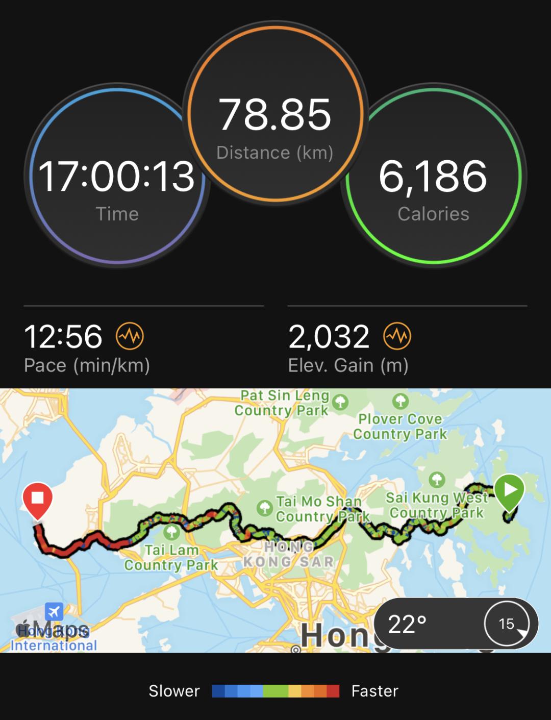 结果是,从黄金海岸到龙鼓滩,算上等红绿灯和走错路、 找路的时间,全程 16K 的平均配速是 5:30……