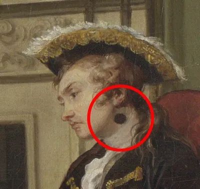 《时髦的婚姻:求医》局部图,威廉姆·荷加斯,1743年。© Public Domain现在你可以试着“寻找18世纪画作中的梅毒黑斑”了。