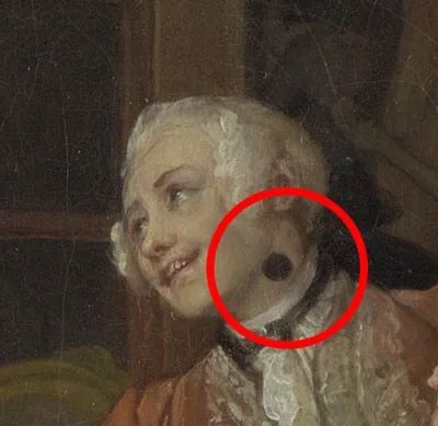 《时髦的婚姻:求医》局部图,威廉姆·荷加斯,1743年。© Public Domain这位少女也有黑斑: