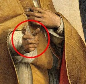 显然,拉斐尔是一位绘画大师,所以他应该知道怎么画手脚。有一种说法是,拉斐尔给西克斯图斯教皇画上第六根手指是在玩文字游戏(译者注,Sixtus是罗马名,直译成英语是sixth,第六个)。还有一种说法认为第六个指头暗指人物有第六感。