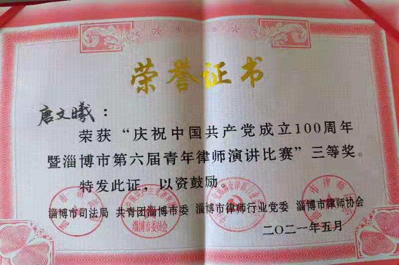 律师工作科◆5月22日,组织2名律师参加淄博市第六届青年律师演讲决赛,大地人(临淄)律师事务所田靖、山东全正(临淄)律师事务所唐文曦分别荣获一等奖、三等奖,齐鸿律师事务所张立雪荣获优秀奖,临淄区司法局荣获优秀组织奖。