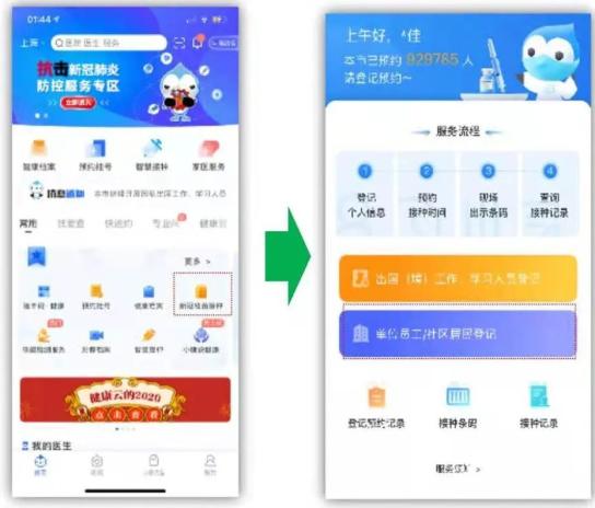 i.线下安排,将直接通知单位负责人安排接种。ii.线上安排,可通过新冠接种服务专区下方“登记预约记录”进入预约,预约完成后,按规定时间前往接种点接种并出示个人接种条码。
