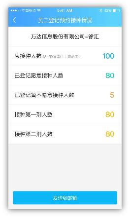 3)登记成功,获得单位编码,可选择截图或页面右上方分享链接予公司内部人员。若本单位信息填写有误,可以点击修改单位信息调整。4)负责人可点击员工登记预约接种情况按钮,查看到本单位内员工登记预约接种情况。员工明细表可以通过点击发送到邮箱,健康云平台会将表格附件发送到企业负责人预留的邮箱地址。