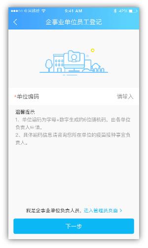 1)填写单位编码,进入下一步。(点击负责人分享链接直接进入下一步,单位编码有企业负责人员提供)