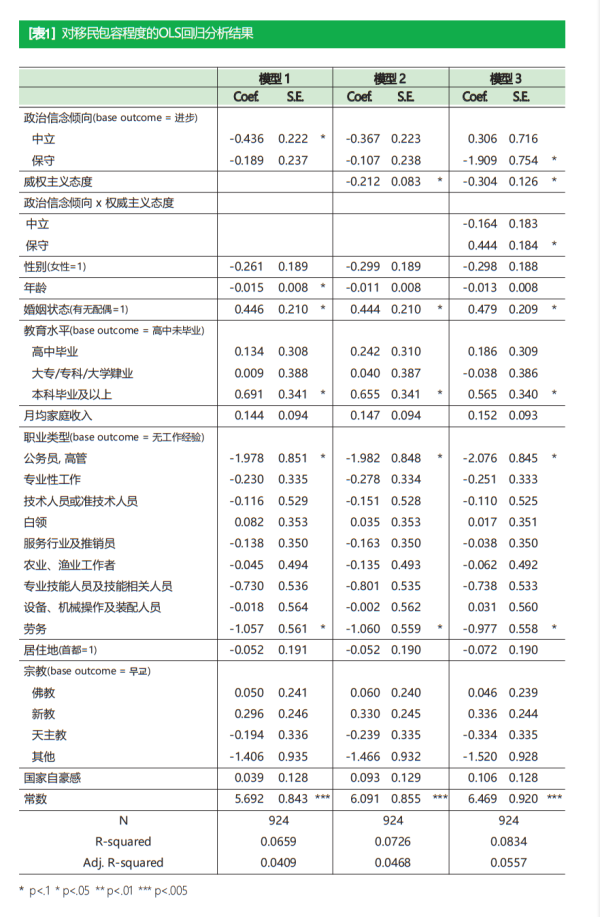 为什么是威权主义倾向? 如果说保守派和进步派内部产生分化是事实,并存在促使其分化的因素,那么为什么这个因素偏偏是威权主义倾向? 我认为这与本研究涉及的包容移民的程和是否受政治信念直接影响有关。也就是说,韩国社会虽然频繁的出现移民问题,但其本质上还没有被正式政治化,因此保守和进步的立场也没有确定下来。因此,根据个人社会文化背景和价值观不同,阵营内部存在不同立场的可能性较大。韩国社会对于没有正式被政治化的社会问题,在区分立场差异时“威权主义倾向”社会文化特性起到强烈作用。即在决定移民态度上,政治信念和威权主义倾向相互作用的可能性较高。在进步派内部,威权主义倾向较高的人和倾向较低的人对移民的态度也会不同。保守派内部也是如此。威权主义倾向的政治化问题与一般意义上的保守主义理念较为符合,对于韩国社会类似包容移民等政治化倾向不明显的问题,不区分保守派和进步派。