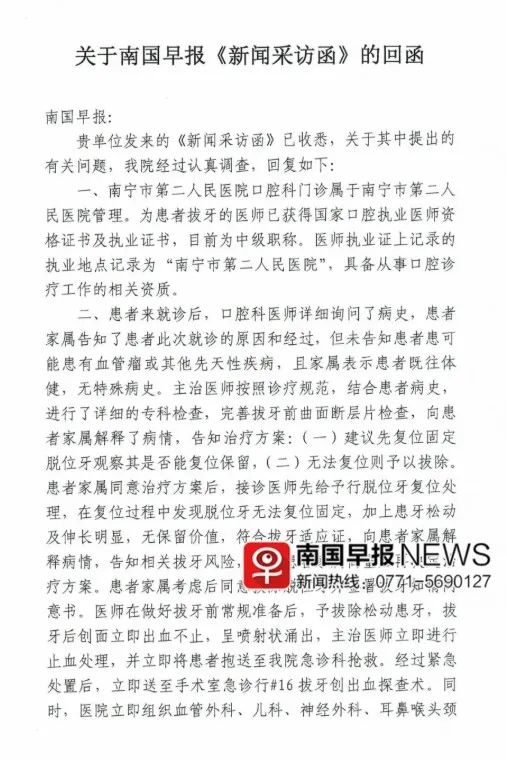 对此,南宁市第二人民医院给记者发来了书面答复。