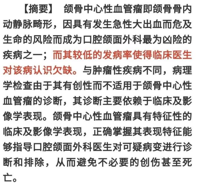文章称,颌骨中心性血管瘤是极为凶险的疾病之一,希望引起口腔同行们的高度警惕