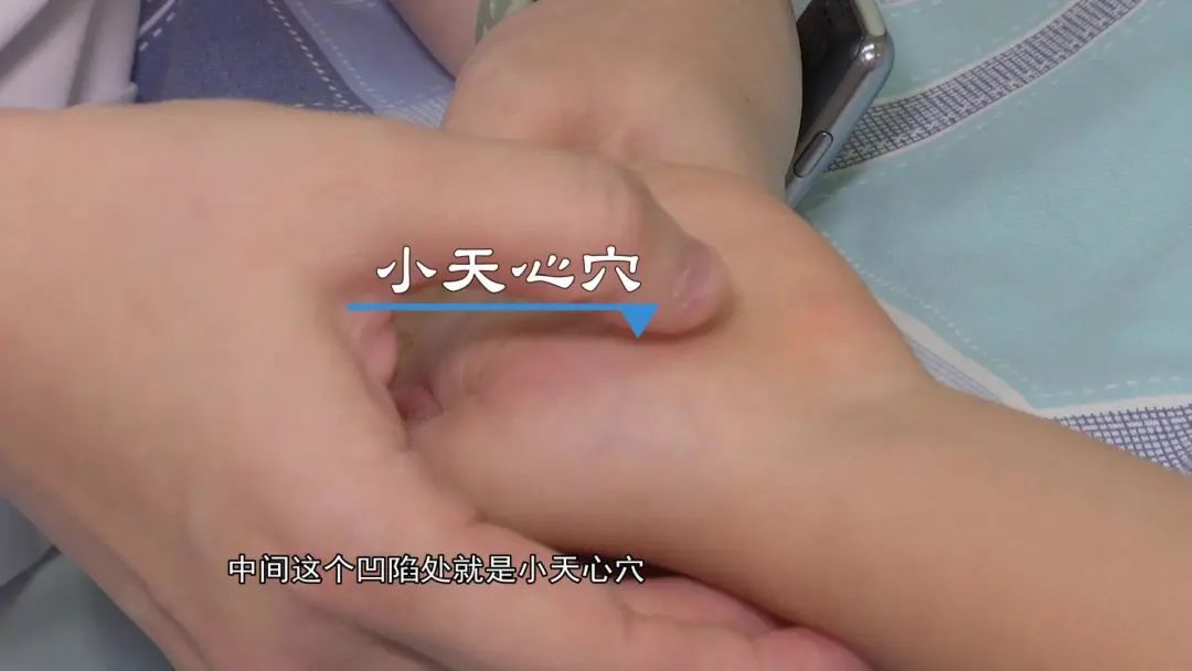 位于大小鱼际交界的地方,中间这个凹陷处就是小天心穴,拇指指腹放在小天心穴上进行按揉,力度适宜。