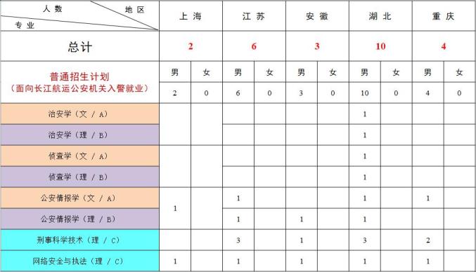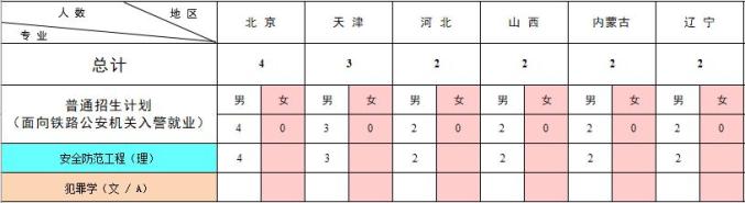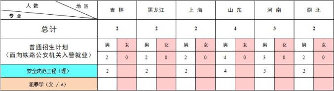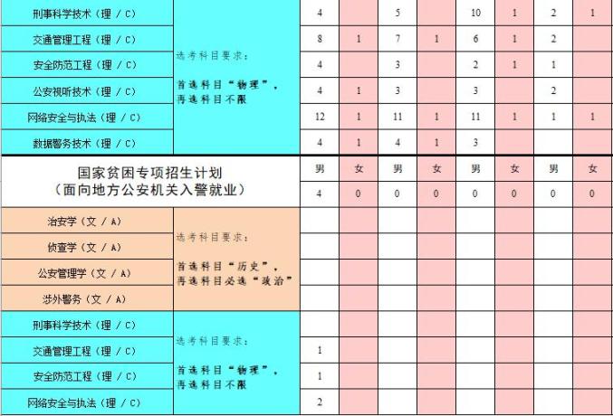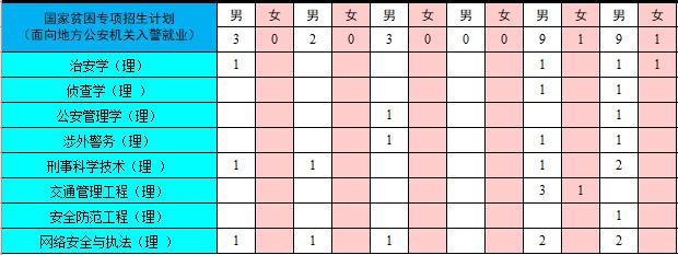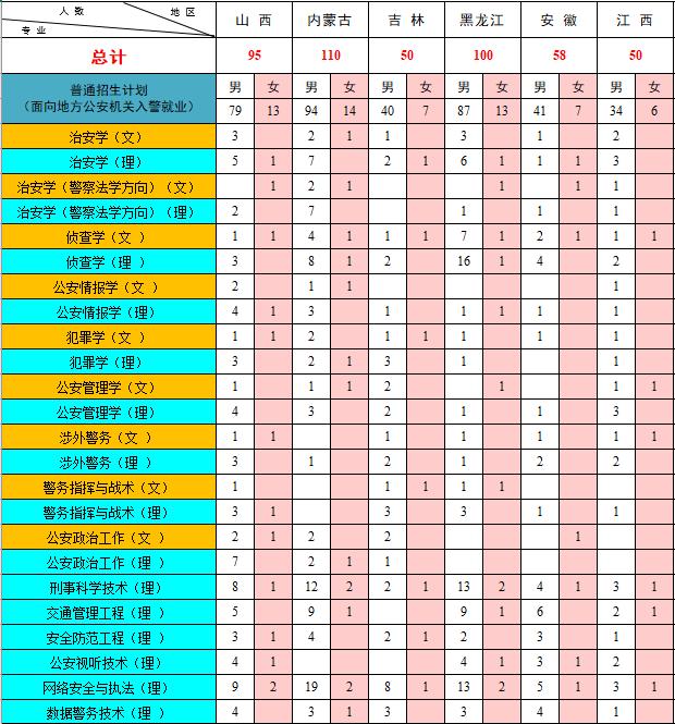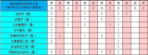 2、新疆计划中含新疆高中班计划 16 人。其中:男生 14 人,即治安学(文)1 人、治安学(理)1 人、治安学(警察法学方向)(文)1 人、治安学(警察法学方向)(理)1 人、侦查学(文)1 人、侦查学(理)1 人、公安管理学(文)1 人、公安管理学(理)2 人、公安政治工作(文)1 人、公安政治工作(理)1 人、交通管理工程(理)3 人;女生 2 人,即治安学(理)1 人、侦查学(理)1 人。