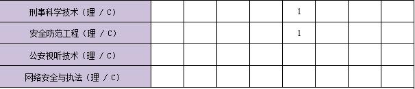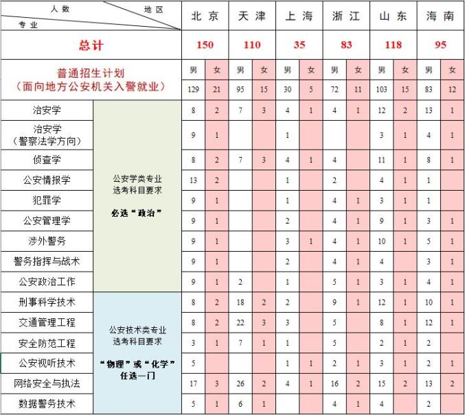 备注1、在北京、上海、海南等省(市),招生计划不分文科、理科和 A 类、B 类、C 类。其中,治安学(警察法学方向)、侦查学、公安管理学、涉外警务等专业选考科目要求为必选政治;公安视听技术专业选考科目要求为“物理”或“化学”任选一门。