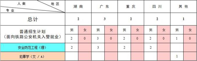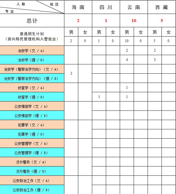 备注1、西藏计划中含内地西藏班计划 12 人。其中:男生 10 人,即治安学(文)1 人、治安学(理)1 人、侦查学(文)1 人、侦查学(理)4 人、公安管理学(文)1 人、公安管理学(理)1 人、交通管理工程(理)1 人;女生 2 人,即治安学(文)1 人、交通管理工程(理)1 人。