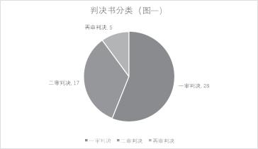 笔者根据审理程序不同,对50份判决书进行初步分类,结果如图(一)所示:有28份为一审判决,17份二审判决,5份再审判决。