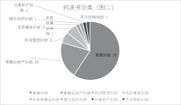 笔者根据案由纠纷不同,对50份判决书进行分类,结果如图(二)所示:有29份离婚纠纷,10份离婚后财产纠纷,3份民间借贷纠纷,3份法定继承纠纷,1份所有权确认纠纷,1份赠与合同纠纷、1份分家析产纠纷,1份不当得利纠纷。