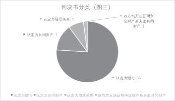 笔者根据出资性质不同,对50份判决进行分类。如图三所示:其中38份判决书认定为赠与,而这38份判决中其中18份认定为出资父母对于己方子女单方赠与,20份判决认定为双方的赠与。有7份判决无证据证明系父母出资,因此财产性质认定为夫妻二人共同财产。1份判决双方均无法证明争议财产系夫妻共同财产,法官不予处理。认定为借贷关系判决有4份,其中借贷关系成立与不成立各1份,1份因为债务涉及案外人未作处理,1份将父母出资部分认定为临时性的借贷。