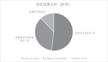 笔者从判决中针对一方子女多分(认定为借贷关系成立也视为一方子女多分的情况)的情形,房产由双方平均分割的情形,诉请未得到法院支持三种结果进行分类。如图四所示:其中26份判决对于出资方子女多分,18份判决夫妻双方平均分割房产,6份判决的诉请不予支持。