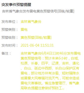 吉林省气象台6月4日11时46分发布雷电黄色预警信号:预计未来6小时,白城、松原、长春、四平、辽源、吉林、通化、白山、延边中西部、长白山保护区有雷电,部分地方伴有冰雹、短时强降水或雷暴大风等强对流天气,可能会造成雷电灾害事故。