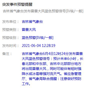 吉林省气象台6月4日12时24分发布雷暴大风蓝色预警信号:预计未来6小时,长春北部和中东部、吉林中北部部分地方将出现雷暴大风,同时可能伴有短时强降水或冰雹等强对流天气。