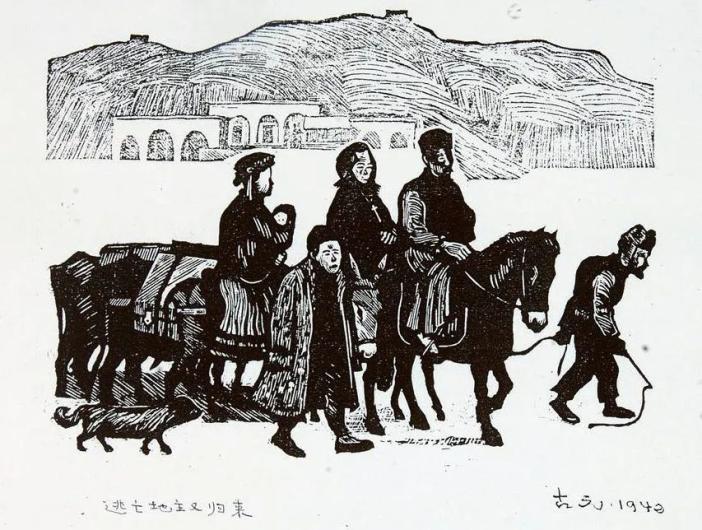 ↑古元创作的《逃亡地主又归来》(资料照片)。延安文艺纪念馆提供当时,古元听老乡说附近田崖庄逃到“白区”的地主姚老大又回来了,立刻敏锐捕捉到地主归来的意义。这正反映了当时土地政策的转变。为了建立和巩固抗日民族统一战线,停止没收地主土地的政策后,中共实行减租减息的土地政策,提高农民的抗日积极性,联合地主阶级一致抗日。