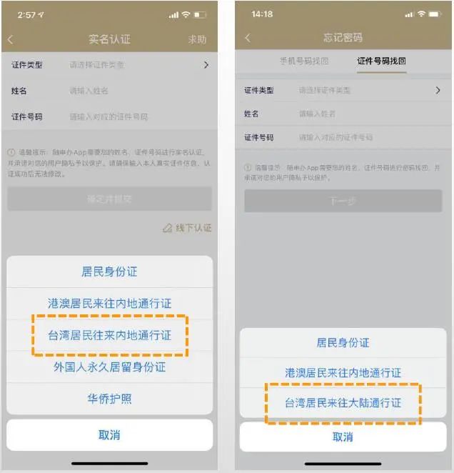 1、实名认证/找回密码支持【台湾同胞往来内地通行证】证件;