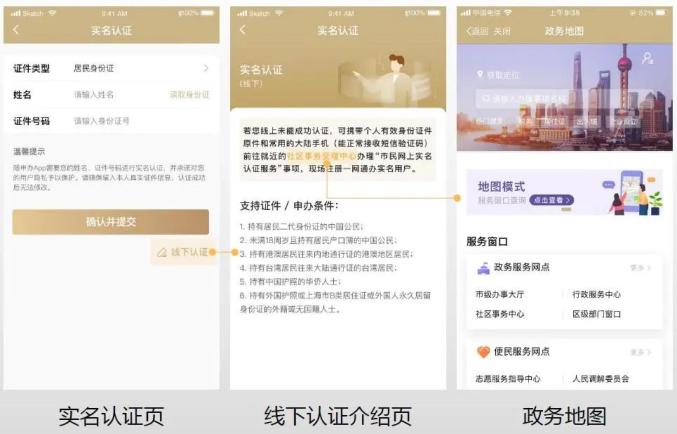 2、支持线下实名认证;实名认证页面增加【线下认证】入口,页面提示的【社区事务受理中心】点击后可跳转至政务地图服务,方便用户查找就近的社区事务受理中心;