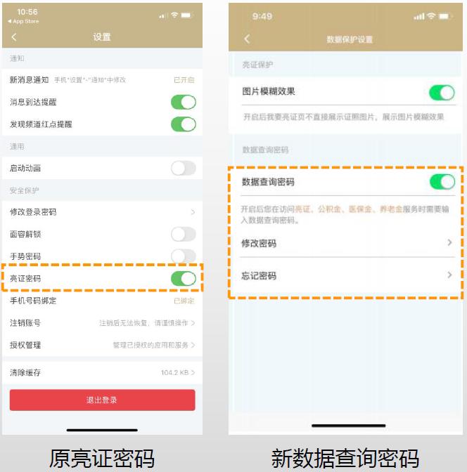 用户可设置是否开启访问亮证、三金账单、养老金、医保金、公积金数据查询密码;