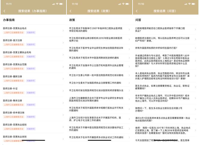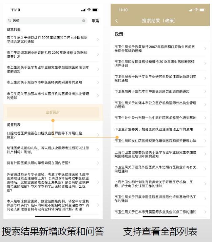 三、搜索搜索结果新增展示政策与问答内容;可点击【更多】查看全部办事指南、政策、问答页面;