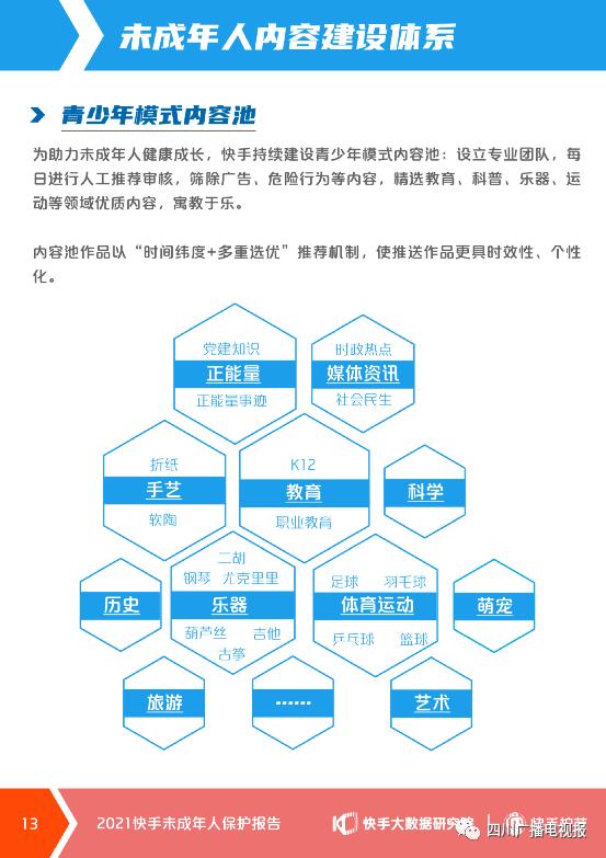在未成年人内容建设方面,快手持续升级青少年模式内容池,设立专业团队,每日进行人工推荐审核,精选手艺、乐器、球类运动、教育、历史、科学、萌宠、旅游等40余类适合未成年人观看的正向内容,并引入优质政务内容和媒体资讯,提高青少年模式内容丰富度。