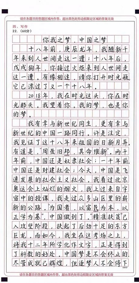 (唐楚玥的作文)2018年深圳市文科状元温卓越的高考满分作文,被广东省评卷组和考试作为标杆作文公布。作文能拿到满分,源于两个原因,一是她的作文在遣词造句上没有任何问题,语句通顺,文笔流畅,集可读性与思想性为一体。二是她写作文的字迹非常漂亮,每一个字体和标点符号都写得工整、严谨,整个卷面看起来赏心悦目,令人非常舒服。