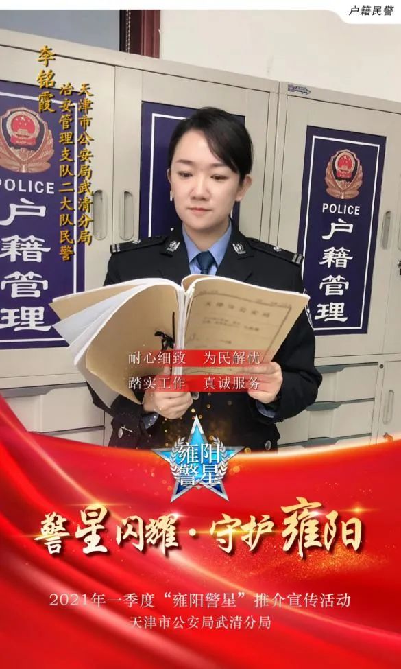 李铭霞,女,35岁,中共党员,本科学历,现任公安武清分局治安管理支队二大队民警,平时主要负责户口审批,企业成批成建制落户,门楼牌设置,指导派出所户籍业务等工作。