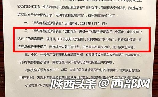 西安北斗物业管理有限责任公司客服部蒋丽丽告诉记者,为了规范电动车停放,他们目前会在所管辖的小区内配备专人进行监控、楼道的巡查以及电动车充电桩的安装,“下一步我们也将考虑使用‘梯控装置’,以便于更高效的对其进行管理。”