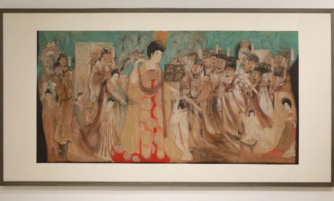 “在创作时我使用了跨时空的手法,把盛唐时期的书画家和书画经典作品进行了重新布局和组合,增强了画作的视觉冲击力。”唐勇力说,作品中还融合了自己对于敦煌壁画的研究,通过融入斑驳脱落的效果,使画作在最终呈现上更具有历史感、文化感、艺术感。