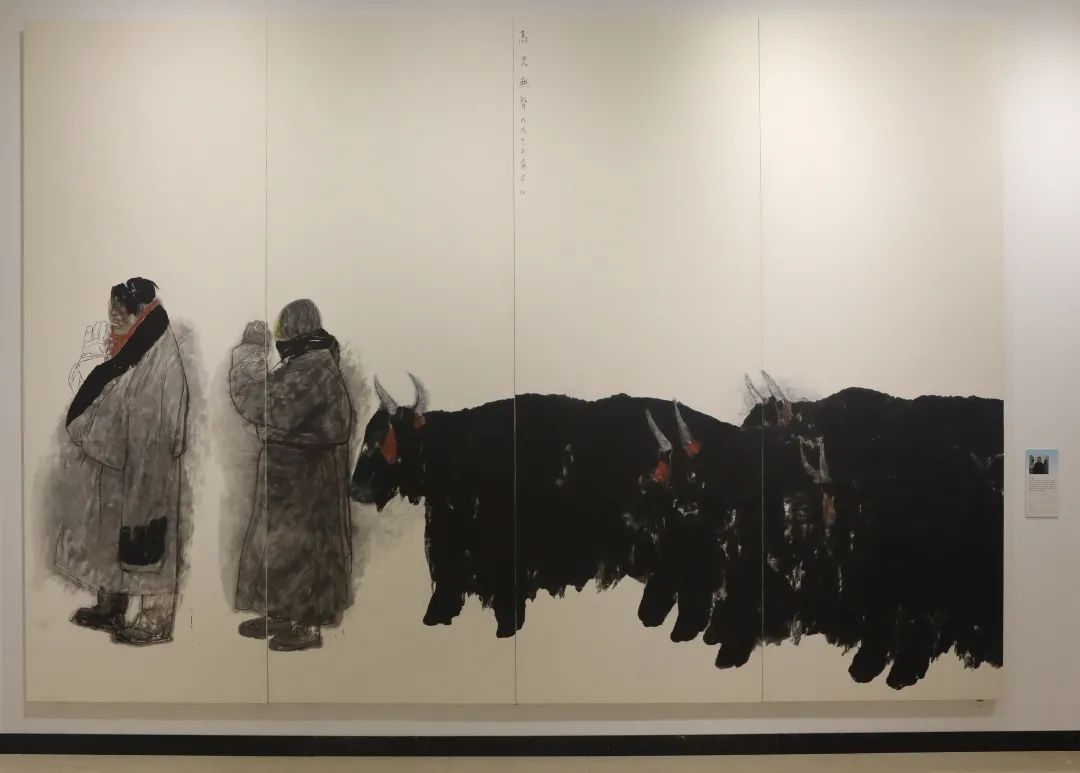 “当时在西藏看到藏族青年在劳作的同时,仍向着同一个方向虔诚地朝拜,场景十分感人。我便打破常规,用大块的浓墨和长线展现眼前的景象,力求使绘画更有力量感,对比更加强烈。”指着展厅中巨幅的画作,袁武介绍道。