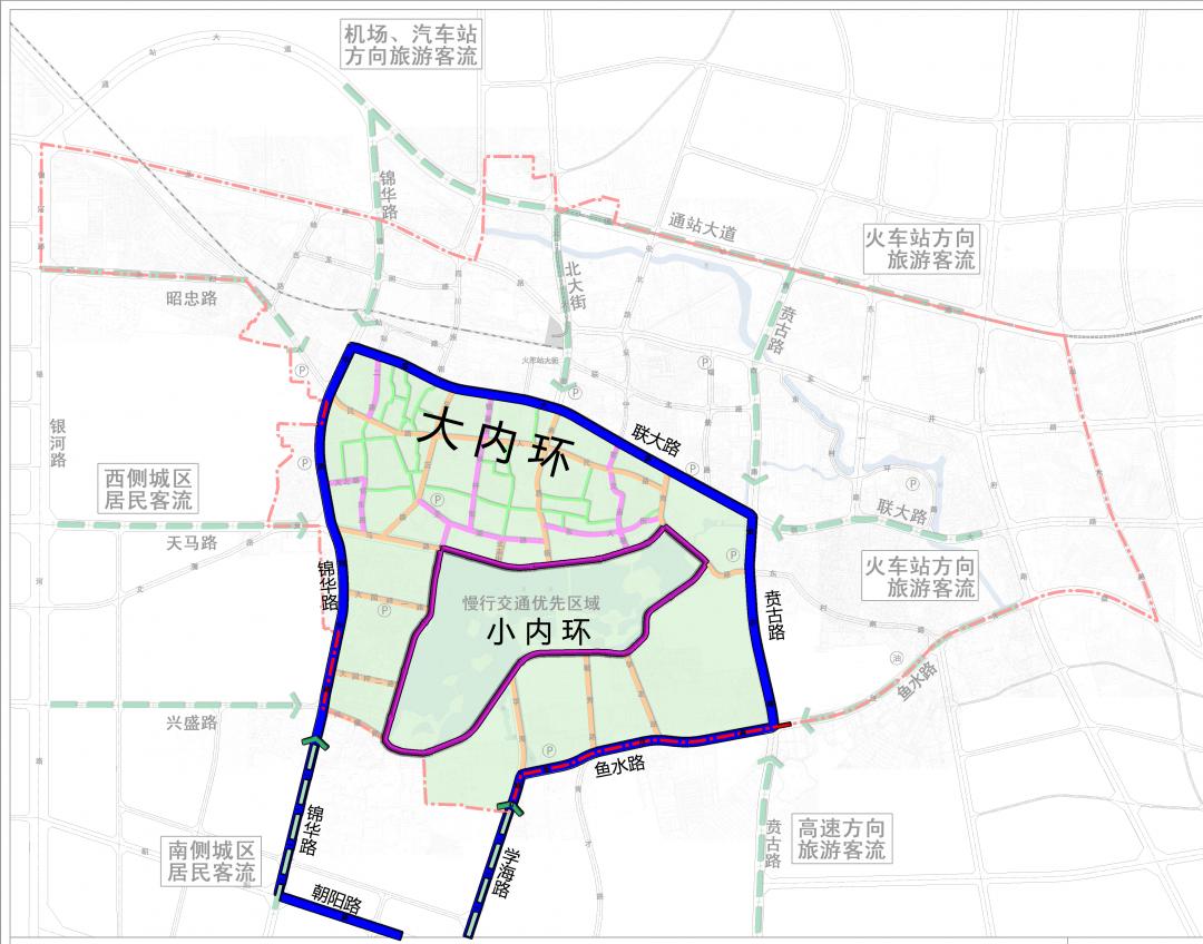 目前,南湖周边采用小内环、大内环、对外交通联系三个层次控制其交通组织:环湖的东、南、西、北道路形成宜人的慢行交通网络小内环,在保护南湖肌理和滨水景观的同时提升慢行交通的便捷性。选取南湖周边的主次干道:锦华路、联大路、贲古路、鱼水路、学海路、朝阳路形成大内环道路系统,大内环的道路系统采用双向车行道路、单向车行道路、慢行街巷形成。南湖地区通过锦华路、北大街、贲古路、学海路南北向主干道联系北部和南部城区,天马路、兴盛路、朝阳路、鱼水路东西向主次干道联系东部和西部城区。南湖周边鼓励慢行交通,在外围地区通过合理的路网组织,确保南湖周边与城市路网的有机衔接和与对外交通门户的顺畅联系。