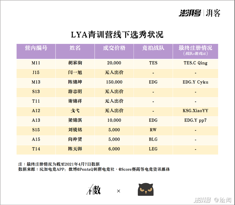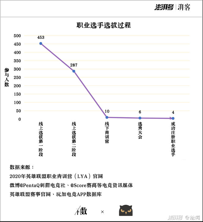 线上选拔第一阶段前,有453人报名;而到了晋级线下青训营的榜单,则剩下10人;选秀大会有幸被赏识的仅有6人;而最终正式注册成为职业选手的只有其中的4人而已。