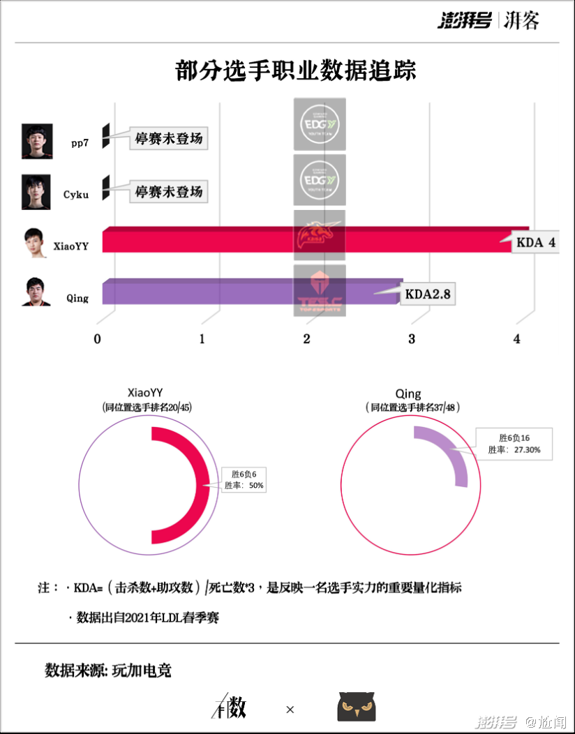 Pp7、Cyku和Qing稍显幸运,他们加入的是EDG.Y和TES.C,属于EDG和TES的二队。这类队伍,由于和LPL的明星队伍同属一个电竞俱乐部,分享同一个队名前缀,因而能够多获得一些瞩目;更多的LDL队伍则是陌生的名字,比如XiaoYY所在的KSG。