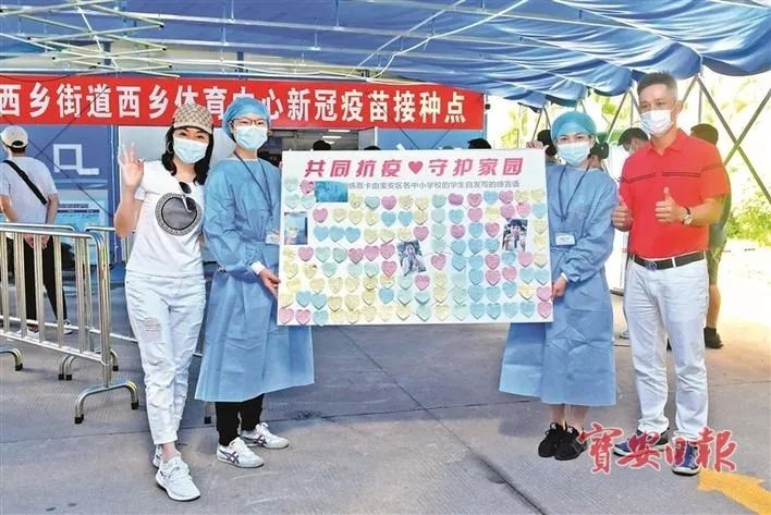 细致排查,构筑屏障,宝安网格、城管、社区“三位一体”为重点人员提供登门服务。防控一线,青春力量绽放,宝安团区委组织青年突击队、志愿者、义工参与防疫服务,“红马甲”成为人们最值得信赖的托付——5月31日下午,松岗体育中心疫苗接种点入口处,一位年轻妈妈抱着熟睡的孩子请求帮助:“我抱不动了,谁帮帮我?”现场义工罗书军连忙迎上去抱过孩子,这位妈妈则扭头汇进接种疫苗的人流,20多分钟后才回来。把孩子交回给家长时,罗书军打趣地说:“我们都戴着口罩,你刚刚都不知道孩子交给了谁吧?”孩子妈妈笑弯了眼角,笑容示意清晰:“我知道你是“红马甲”呀!”