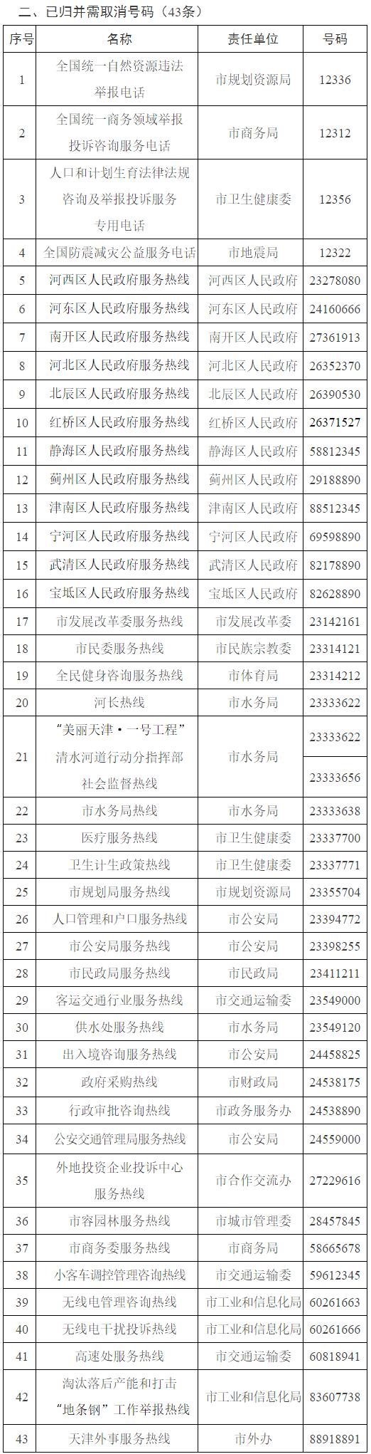 43条已归并但未取消号码的热线全部取消号码,包括国务院有关部委设立并在本市接听的12336等4条热线和本市有关区、部门设立的23278080等39条热线。(责任单位:市政务服务办等市级有关部门,有关区人民政府;完成时限:本方案发布之日起1个月内)