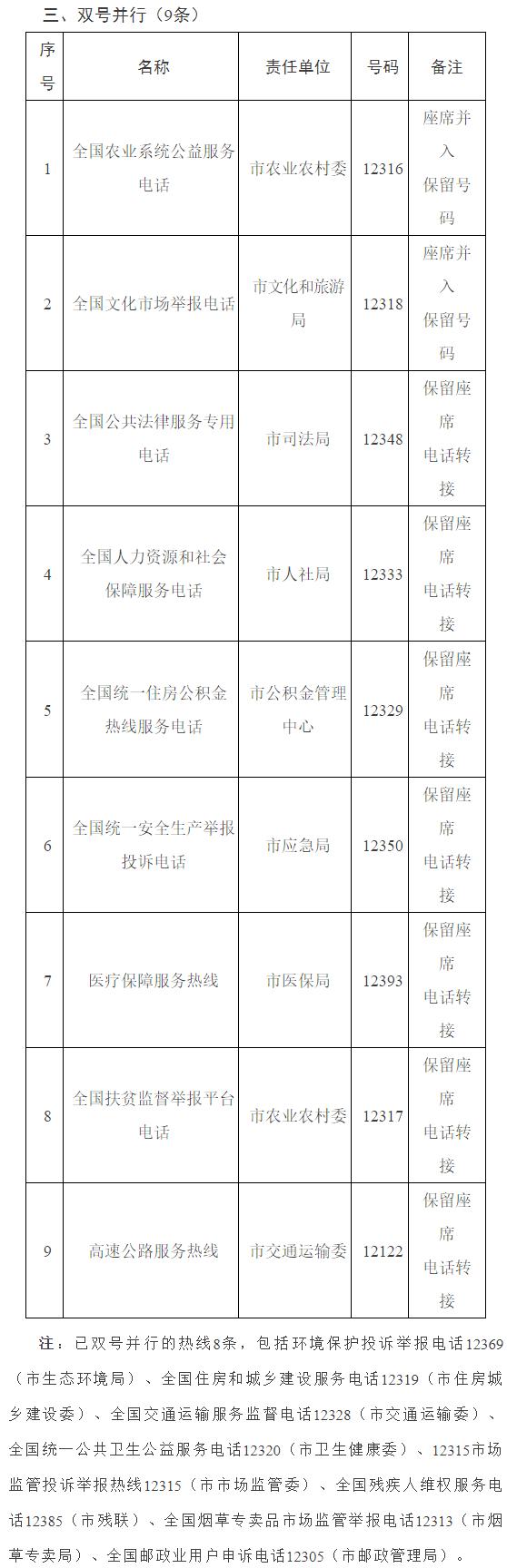 国务院有关部委设立并在本市接听的12316等2条热线保留号码,将话务座席并入12345热线统一管理;12348等7条不具备归并条件的热线,保留话务座席,与12345热线建立电话转接机制,统一服务标准,按照12345热线服务标准升级改造。(责任单位:市政务服务办等市级有关部门;完成时限:2021年9月底)