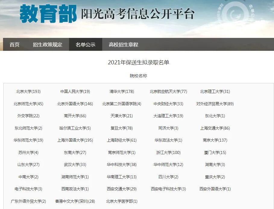 6月9日,川观新闻记者从教育部阳光高考信息公开平台获悉,2021年全国48所高校,共拟录取1879名学生,其中北京大学(包括北京大学医学部1人)拟录取194人,清华大学拟录取178人。