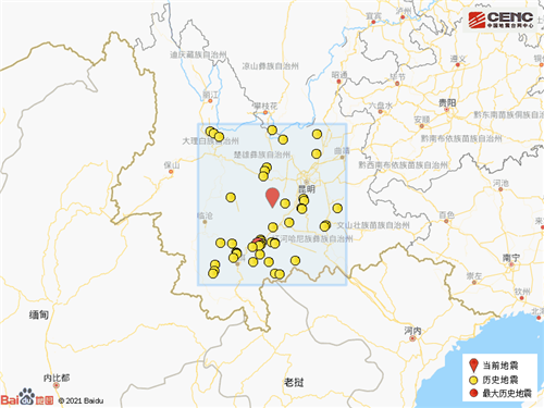 历史地震:根据中国地震台网速报目录,震中周边200公里内近5年来发生3级以上地震共61次,最大地震是2018年9月8日在云南普洱市墨江县发生的5.9级地震(距离本次震中124公里),按震级大小前50次历史地震分布如图。