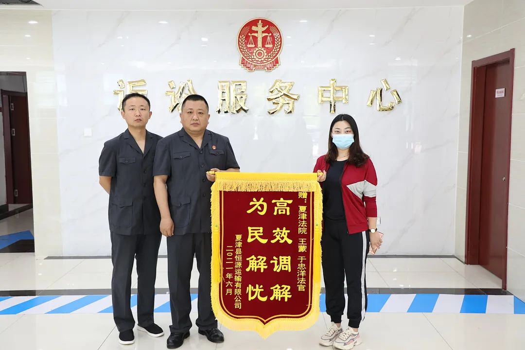 6月1日,夏津县某运输公司员工将一面“高效调解 为民解忧”的锦旗送到速裁法官王蒙手中,对法官高效办案表示感谢。2021年3月份,该运输有限公司驾驶员驾车与前车追尾相撞,发生交通事故,造成两车不同程度的损坏。保险公司怠于履行赔偿义务,为了维护自身合法权益,运输公司将保险公司诉至法院,诉前调解阶段,经过对车损的评估后,诉讼服务中心法官迅速安排调解员对原、被告的纠纷进行诉前调解,双方于5月31日达成调解协议。考虑到一方当事人从事的是运输行业,有较重的时间成本,为了让当事人只跑一趟把事情办完,双方当事人在速裁法官指导进行司法确认申请,并于当日完成司法确认手续。