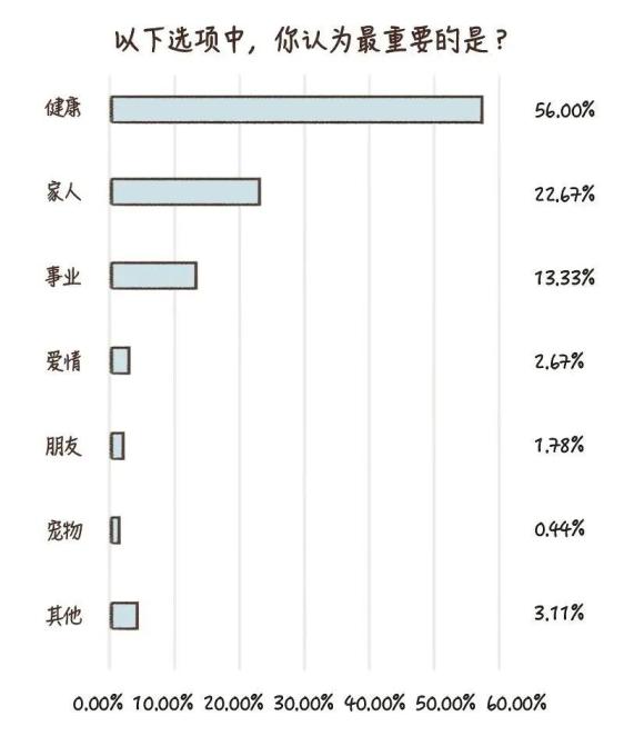 在实际生活中,当人们以一些抽象的标准去择偶时,可能会比使用可量化标准找对象,更困难一些。(但不是说这样不好啊~)此外我们还发现,虽然很多人“想脱单”,但实际上可能缺乏动力,难以真正行动起来。在 “人生重要选项排序”上,只有2.67%的人将爱情至于首位。
