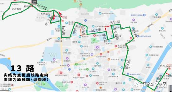 13路:起点站联花路(植物园北)经花街路、北环路、教工路(单行)、括苍路、城北街、中山街、清远街、北苑路、城北街、紫金路、寿尔福路、天宁街、开发路、城北街、和平路、丽阳街、开发路、汽车东站、水东大桥、水东路至终点站水东公寓迎曦园。