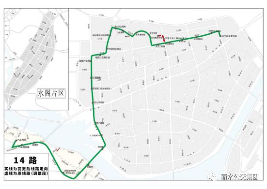 14路:起点站天宁公交首末站经东地路、城北街、宇雷北路、清远街、中山街、城北街、括苍路、小水门大桥、环城南路、绿谷大道至终点站汽车西站。